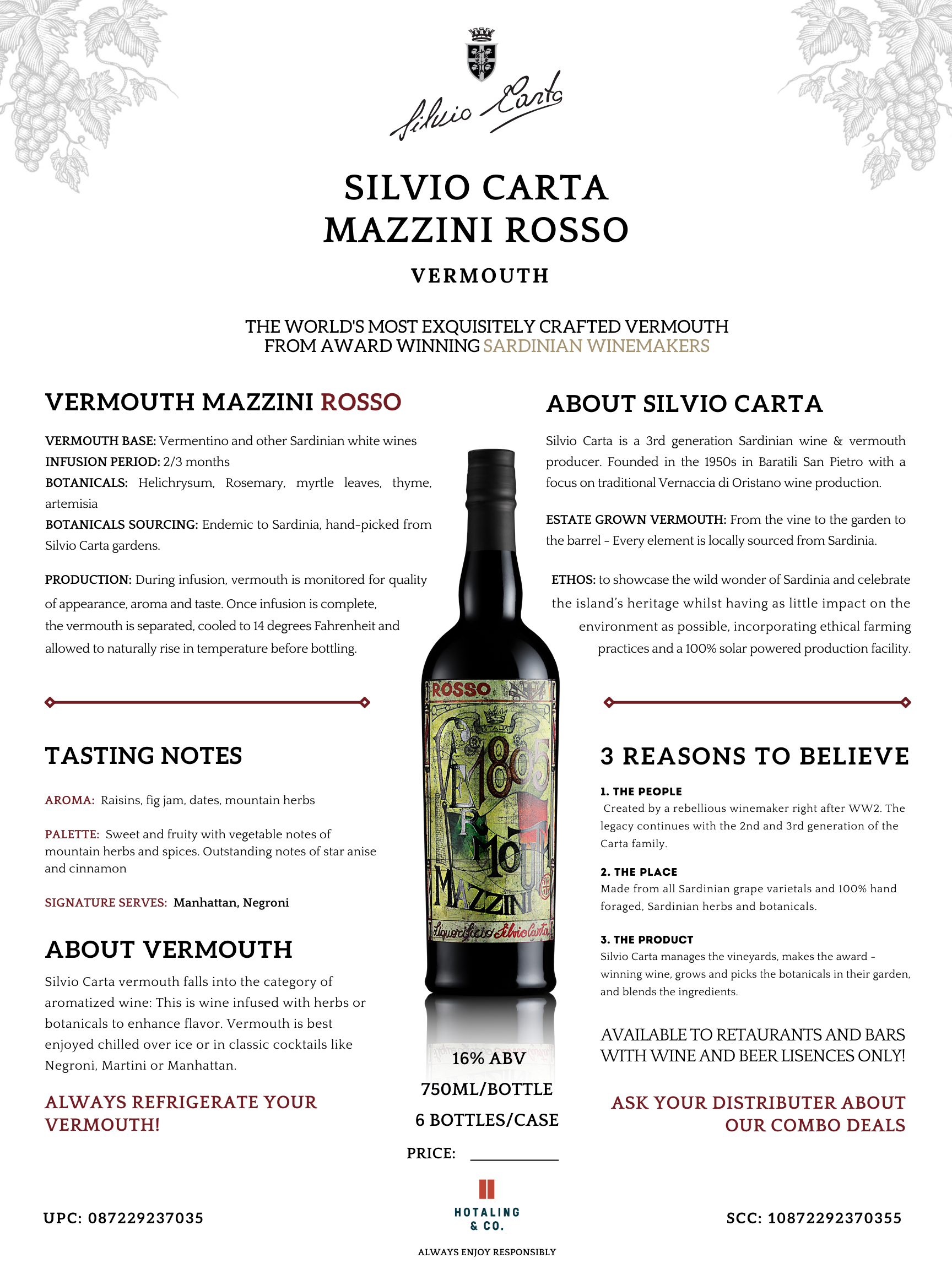 A Vermouth made with a base of Vermentino and other Sardinian white wines. This is infused for 2/3 months with a carefully selected assortment of botanicals including Helichrysum, rosemary, myrtle leaves, thyme, and artemisia. All botanicals are endemic to the island, handpicked from the Silvio Carta gardens and infused within minutes of harvest. During infusion, the vermouth is constantly monitored for quality of appearance, aroma and taste. Once it has satisfied the high standards of Silvio Carta, the liquid vermouth is carefully separated from the botanicals and cooled to 14 Degrees Fahrenheit for 1 month. The temperature is then allowed to naturally rise, and the vermouth is bottled, ready for consumption.