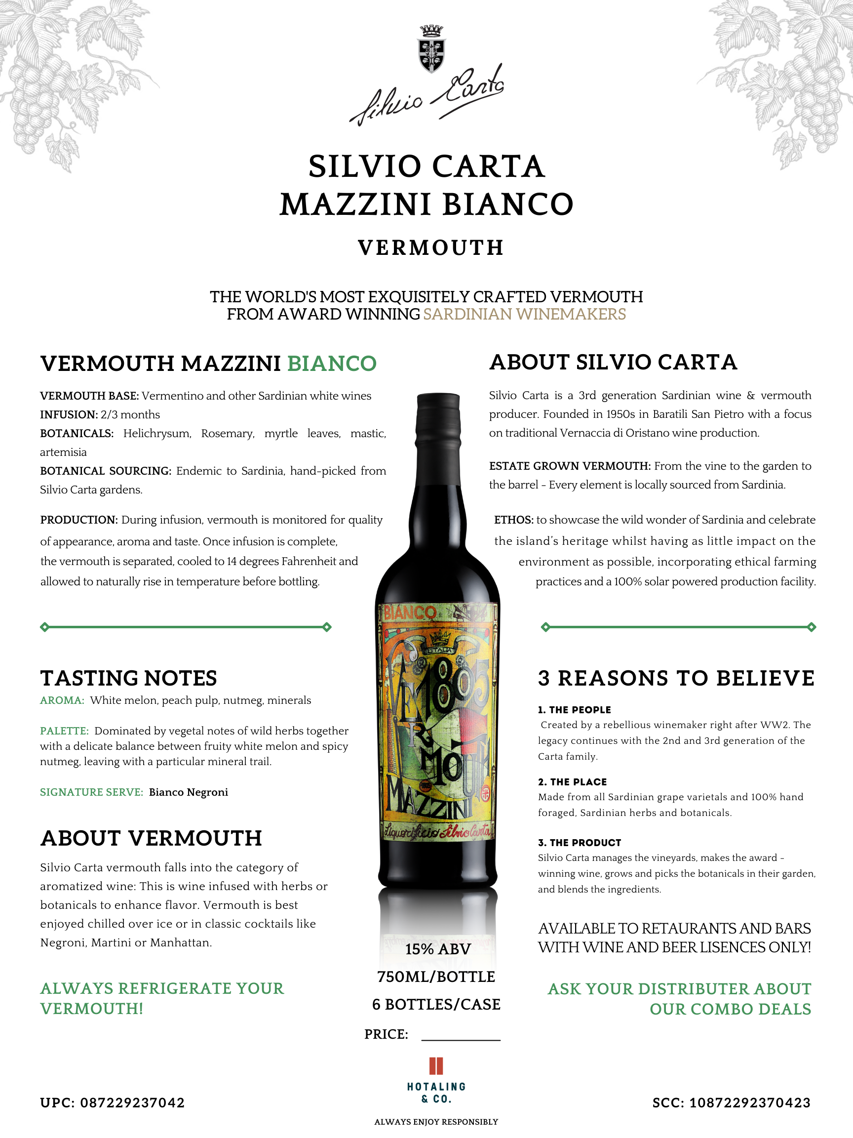A Vermouth made with a base of Vermentino and other Sardinian white wines. This is infused for 2/3 months with a carefully selected assortment of botanicals including Helichrysum, rosemary, myrtle leaves, mastic, and artemisia. All botanicals are endemic to the island, handpicked from the Silvio Carta gardens and infused within minutes of harvest. During infusion, the vermouth is constantly monitored for quality of appearance, aroma and taste. Once it has satisfied the high standards of Silvio Carta, the liquid vermouth is carefully separated from the botanicals and cooled to 14 Degrees Fahrenheit for 1 month. The temperature is then allowed to naturally rise, and the vermouth is bottled, ready for consumption.