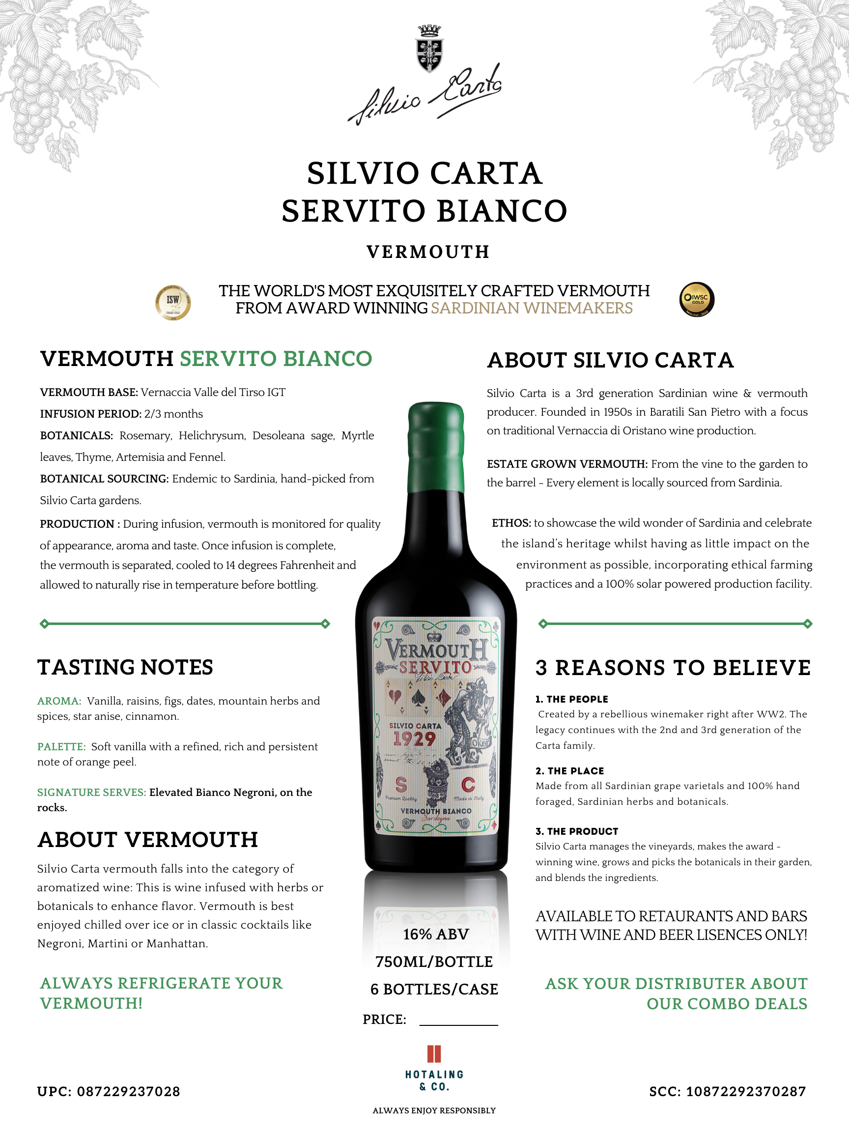 16% View All Silvio CartaBest enjoyed as a chilled aperitif, Servito is the perfect bianco vermouth for sipping - fragrant, soft and savory.