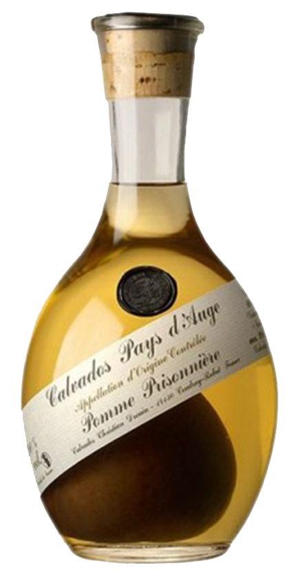 C. Drouin has given a traditional favorite new life by substituting a boskoop apple instead of a pear inside the bottle with Pays d'Auge Calvados. Boskoops preserve better in calvados than any other type. It is harder to grow an apple in a bottle than it is a pear, because apple trees drop much of their crop as the fruit develops. Less than half of the bottles end up with an apple inside, thus making Pomme Prisonnière extremely limited. 40% ABV