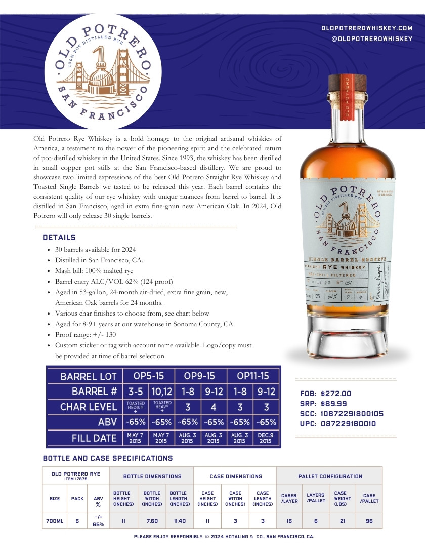 65% View All Old Potrero WhiskeyThis Old Potrero Single Barrel has been fully aged for approximately 8+ years in new toasted 24-month air-dried, extra-fine grain American White Oak barrels, then bottled at cask strength, up to 133 proof.